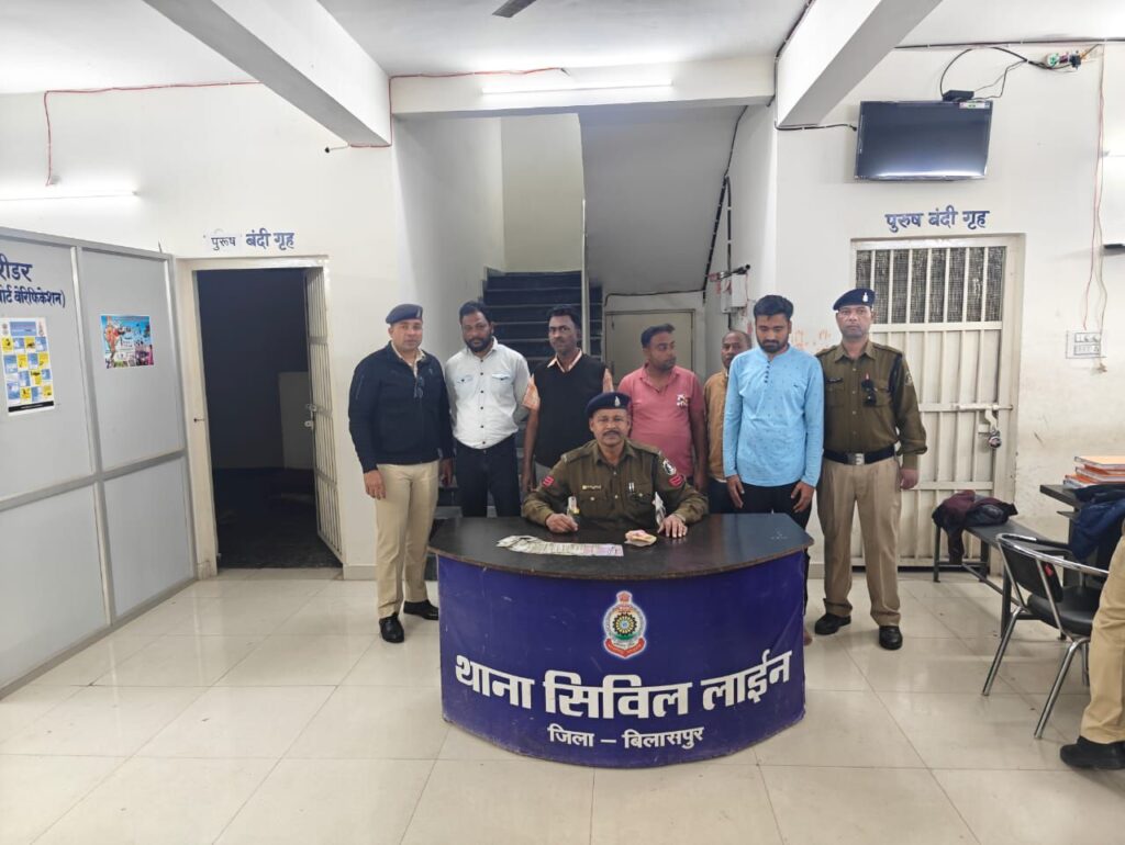 बिलासपुर,,, मामले का संक्षिप्त विवरण इस प्रकार है कि पुलिस अधीक्षक रजनेश सिंह द्वारा जिले मे अवैध जुआ, सटटा के अपराध पर पूर्ण अंकुश लगाने के संबंध मे विशेष अभियान चलाने हेतु आवश्यक दिशा निर्देश हैं एवं श्रीामन अतिरिक्त पुलिस अधीक्षक शहर राजेद्र जायसवाल एवं नगर पुलिस अधीक्षक सिविल लाईन निमितेश सिंह के मार्गदर्शन पर थाना सिविल लाईन पुलिस द्वारा क्षेत्र में लगातार पेट्रोलिंग कर असमाजिक तत्वो शराबियो पर कार्यवाही किया जा रहा हैं। दिनॉक 21.01.2025 को जरिये मुखबीर सूचना मिली कुछ व्यक्ति ईदगाह चौक के पास आम जगह पर रूपये पैसे का कट पत्ती नामक जुआ खेल की सूचना पर त्वरित थाना से टीम तैयार कर मौके पर रेड कार्यवाही किया जंहा कुछ व्यक्ति जुआ खेलते बैठते थे पुलिस को देखकर भागने का प्रयाश कर रहे थे मौके पर 05 जुआडियान मिले जिसके पास एवं फड कुल जुमला रकम 13900 रूपये व तास के 52 पत्ती जप्त किया गया, जुवाडियानों का कृत्य 3(2) छत्तीसगढ जुआ प्रतिषेध अधिनियम का पाये जाने से जुआडियानो के विरूध्द कार्यवाही की गई है। पृथक से प्रतिबंधक कार्यवाही की जाती है।