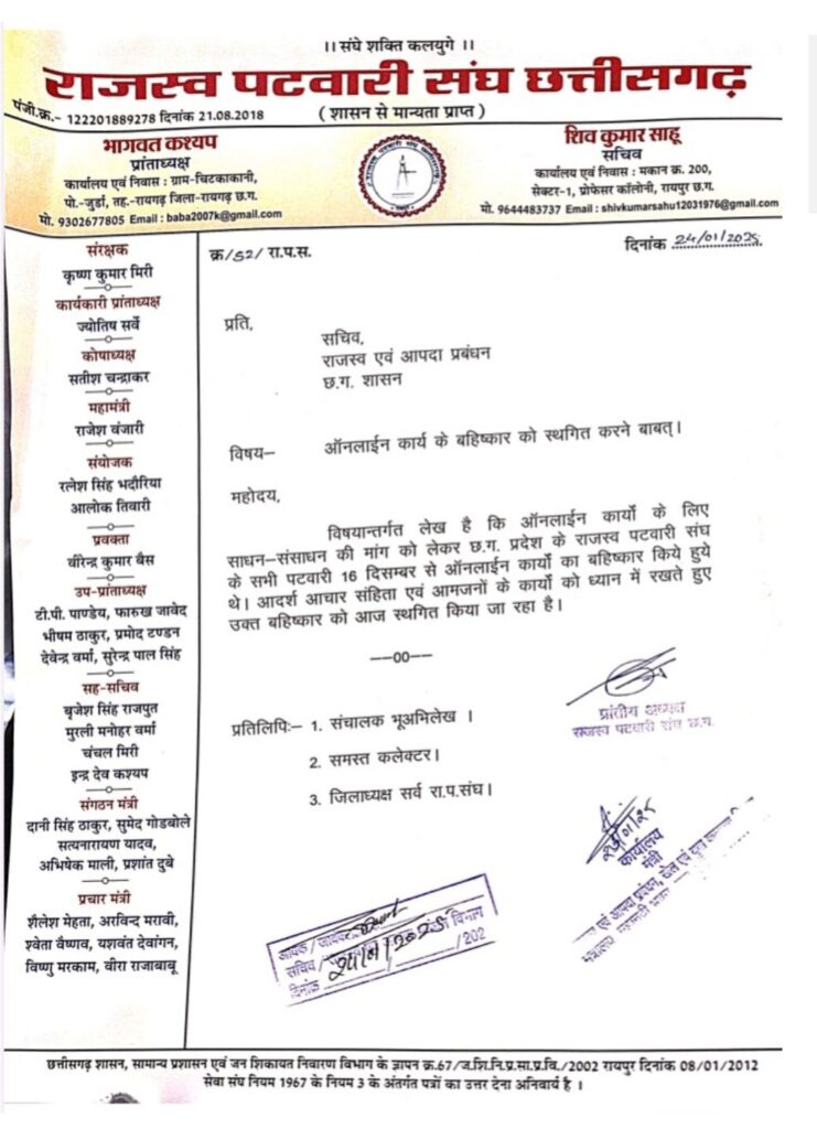 सूत्रों के अनुसार, प्रदेश के राजस्व पटवारी संघ के अध्यक्ष और सचिव ने हड़ताल के संबंध में रायपुर में उच्च अधिकारियों से मुलाकात की थी! लेकिन बातचीत में कोई सकारात्मक परिणाम नहीं आया और उल्टा प्रदेश अध्यक्ष का तबादला कर दिया गया! इस फैसले के बावजूद पटवारी संघ ने चुनाव के दौरान आम जनता की समस्याओं को देखते हुए हड़ताल समाप्त करने का निर्णय लिया!