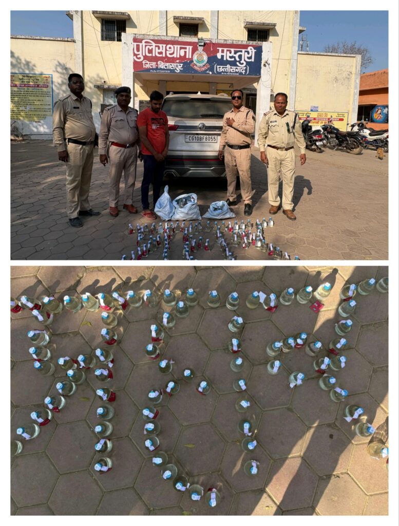 बिलासपुर,,, मस्तुरी थाना क्षेत्र में अवैध शराब के खिलाफ कड़ी कार्रवाई करते हुए पुलिस ने एक आरोपी को गिरफ्तार किया है! जो भारी मात्रा में अवैध शराब परिवहन कर रहा था! आरोपी के कब्जे से 142 पाव (25.560 लीटर) देशी शराब कीमती ₹12,780 और एक सफेद रंग की एमजी हेक्टर कार बरामद की गई! जिसकी कीमत ₹10,00,000 है! आरोपी को गिरफ्तार कर न्यायालय में पेश किया गया इस कार्रवाई में मस्तुरी थाना प्रभारी निरी. हरीशचंद्र टांडेकर और उनकी टीम की महत्वपूर्ण भूमिका रही!