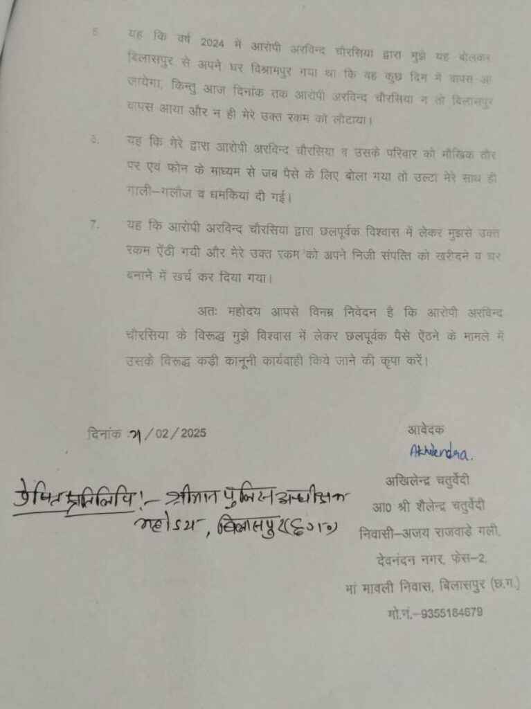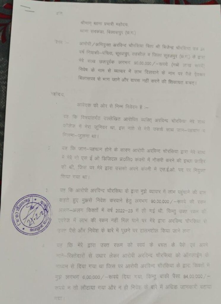 बिलासपुर,,, देवनंदन नगर निवासी अखिलेंद्र चतुर्वेदी ने एसपी कार्यालय में शिकायत दर्ज कराई है! जिसमें उन्होंने अपने दोस्त अरविंद चौरसिया पर 90 लाख रुपए की ठगी का आरोप लगाया है! अखिलेंद्र चतुर्वेदी एक कंपनी के मालिक हैं! जिन्होंने अपने दोस्त अरविंद को भरोसा करके पैसे लगाए थे!