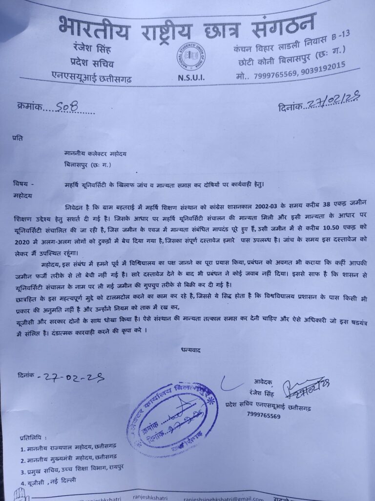 बिलासपुर,,, महर्षि यूनिवर्सिटी पर 10.50 एकड़ भूमि की फर्जी बिक्री का आरोप लगा है! जिसे लेकर एनएसयूआई (NSUI) के प्रदेश सचिव रंजेश सिंह ने कलेक्टर अवनीश शरण से मुलाकात की और मामले की तत्काल जांच की मांग की है!रंजेश सिंह का आरोप है! कि महर्षि यूनिवर्सिटी ने 2002-03 में कांग्रेस शासन के दौरान शिक्षा के उद्देश्य से मिली 38 एकड़ भूमि में से करीब 10.50 एकड़ जमीन को फर्जी तरीके से बेच दिया है!