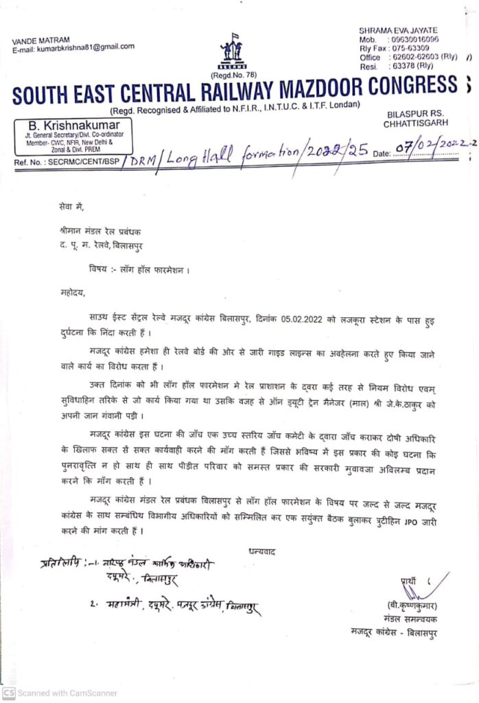 बिलासपुर :- रेलवे मजदूर कांग्रेस बिलासपुर के जोनल प्रवक्ता गोपी राव ने प्रेस विज्ञप्ति जारी कर बताया की रेलवे मजदूर कांग्रेस बिलासपुर के मंडल समन्वयक बी कृष्ण कुमार ने मंडल रेल प्रबंधक बिलासपुर को पत्र कम्रांक 25 दिनांक 07 फरवरी 2022 को पत्र लिखकर 05 फरवरी 2022 को लजकुरा स्टेशन में दुर्घटना में ट्रेन मैनेजर ( मालगाड़ी ) स्वर्गीय जे के ठाकुर की आकस्मिक मृत्यु को रेल प्रशासन की गलत नीतियों, रेलवे बोर्ड के नियम विपरीत कार्य कराने को दोषी ठहराते हुए तत्काल उच्च स्तरीय जांच कमेटी की मांग की तथा दोषी अधिकारियों के ऊपर कानूनी कार्रवाई करने की मांग की । रेलवे मजदूर कांग्रेस हमेशा ही रेलवे बोर्ड के नियम के विपरीत आदेशों का विरोध करती रही है और इस दुर्घटना में स्वर्गीय ठाकुर के परिवार को न्याय दिलाने की लड़ाई में अपना संपूर्ण योगदान दे रही है। दुर्घटना की जानकारी मिलते ही रेलवे मजदूर कांग्रेस के मजदूर नेता बी कृष्ण कुमार ने तत्काल पार्थिव शरीर को लाने में पूरे मजदूर कांग्रेस की टीम को निर्देशित किया।