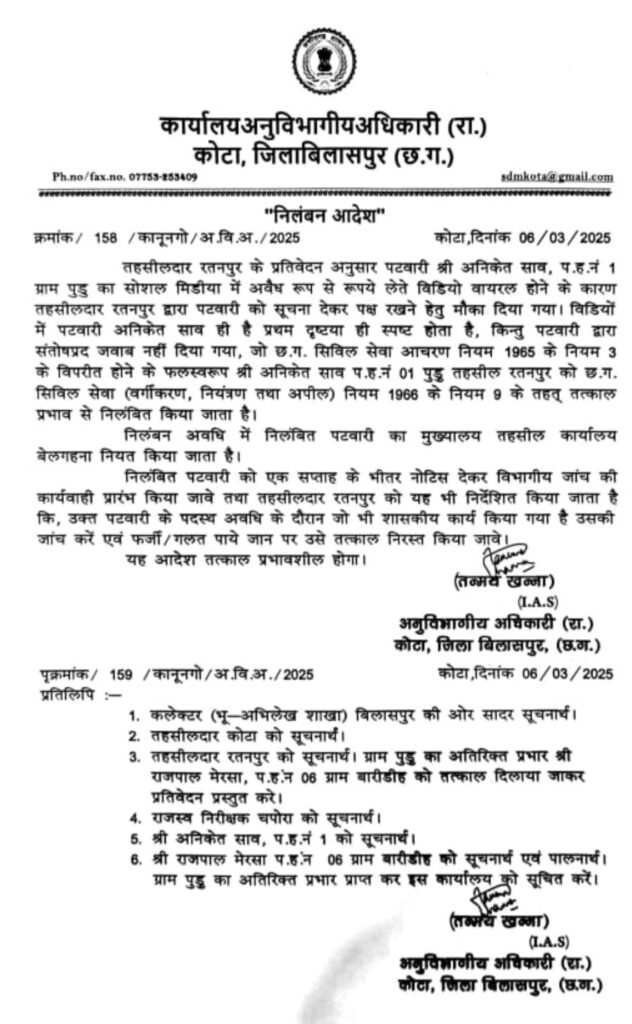 बिलासपुर,,, जिले के रतनपुर तहसील में एक पटवारी को किसान द्वारा रिश्वत लेते हुए कैमरे में कैद किए जाने के बाद कोटा एसडीएम ने उसे निलंबित कर दिया है! यह घटना ग्राम पचरा की है! जहां पटवारी अनिकेत साव पर सरकारी काम के बदले ₹60,000 की रिश्वत मांगने का आरोप लगा है! इस मामले का वीडियो सोशल मीडिया पर वायरल हो गया है! हालांकि इसकी पुष्टि नहीं की गई है!