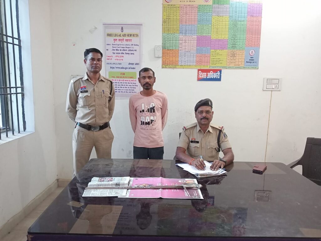 बिलासपुर,,,, थाना तारबाहर को मुखबीर से सूचना प्राप्त हुई कि विद्या नगर शिव मंदिर के पीछे सार्वजनिक स्थान पर एक व्यक्ति हाथ में तलवार लेकर लोगों को डराने धमकाने की धमकी दे रहा है। सूचना मिलने पर थाना प्रभारी कृष्ण चंद सिदार के नेतृत्व में हमराह स्टाफ मौके पर पहुंचे। आरोपी को पुलिस को देख कर भागते हुए पाया गया, जिसे घेराबंदी कर पकड़ा गया। आरोपी के कब्जे से एक तलवार जप्त की गई। आरोपी नीरज ताम्बे को गिरफ्तार कर माननीय न्यायालय में पेश किया गया है।