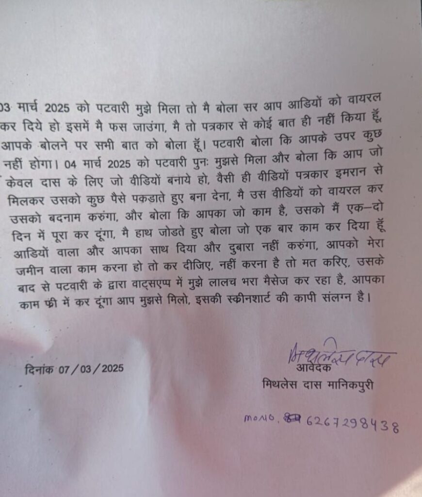 यह मामला तब और गंभीर हो गया! जब 4 मार्च को पटवारी ने मिथलेस पर और दबाव डाला कि वह पत्रकार को रिश्वत देते हुए वीडियो बनाएं, जिससे पत्रकार को बदनाम किया जा सके! लेकिन मिथलेस ने इसके खिलाफ पूरी सच्चाई एसडीएम को बता दी और पटवारी की इस साजिश का पर्दाफाश कर दिया! अब देखना यह होगा कि जिले के उच्च अधिकारियों द्वारा इस गंभीर मामले पर क्या कदम उठाए जाते हैं!