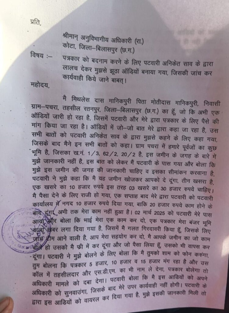 पटवारी ने मिथलेस को दबाव डालते हुए 2 मार्च को ऑडियो रिकॉर्ड करने का आदेश दिया और कहा कि पत्रकार को बदनाम करने के लिए उन्हें ऐसा करना होगा! इस दौरान मिथलेस ने इस साजिश के खिलाफ एसडीएम को शिकायत दी और आडियो के साथ व्हाट्सअप चैट्स के स्क्रीनशॉट्स भी संलग्न किए! इस मामले में मिथलेस का आरोप है! कि पटवारी ने पूरी साजिश रची थी! ताकि वह अपनी रिश्वतखोरी की करतूतों को छुपा सके और एक निर्दोष पत्रकार को फंसाया जा सके!