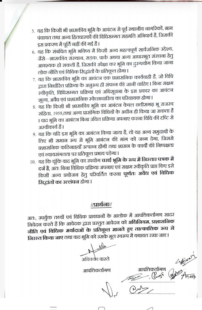 आपत्तिकर्ताओं का कहना है! कि यह भूमि निस्तार पत्रक में चराई मद के तहत दर्ज है! और वर्षों से स्थानीय पशुधन के लिए चराई भूमि के रूप में उपयोग की जा रही है! बिना उचित प्रक्रिया अपनाए इसे किसी विशेष समुदाय को सौंपना ग्रामवासियों के अधिकारों का उल्लंघन होगा!
