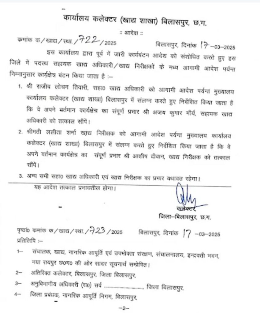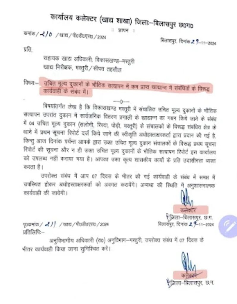जिसके बाद मस्तूरी एसडीएम ऑफिस द्वारा एफआईआर के लिए कलेक्टर के समक्ष प्रस्ताव भेजा गया था लेकिन सहायक खाद्य अधिकारी राजीव लोचन तिवारी और खाद्य निरीक्षक ललिता शर्मा द्वारा कार्रवाई न करते हुए मामले को दबाने का काम किया गया था!
