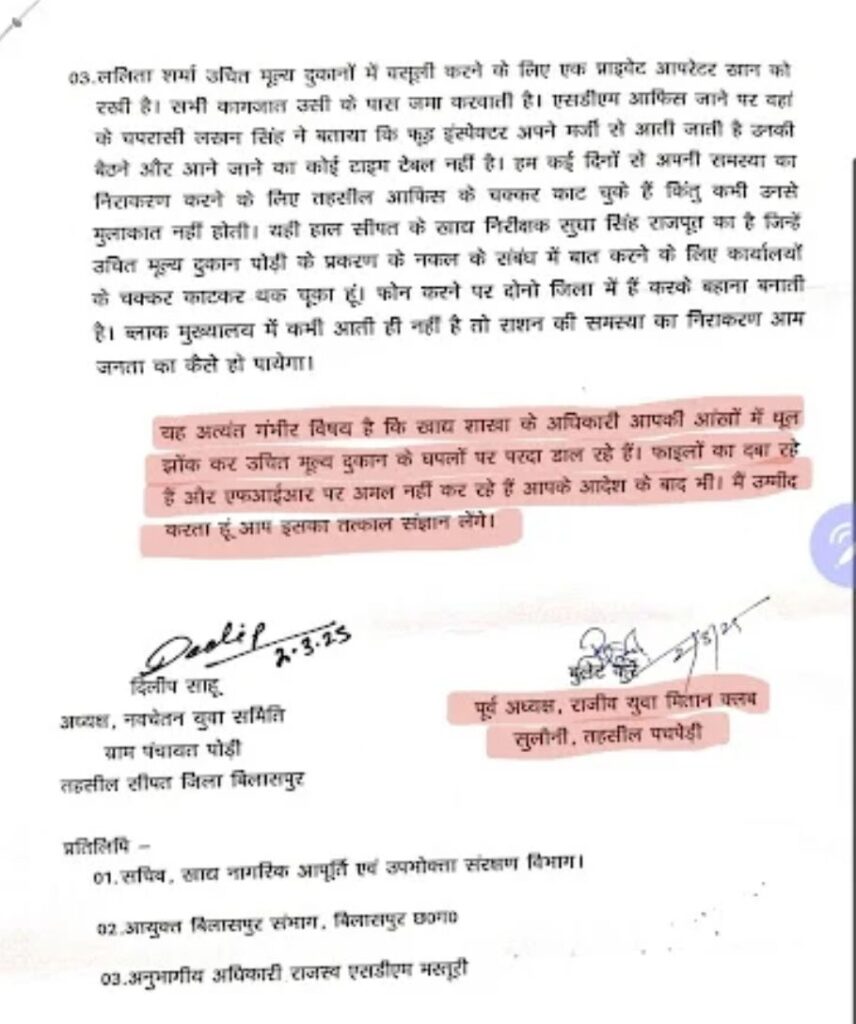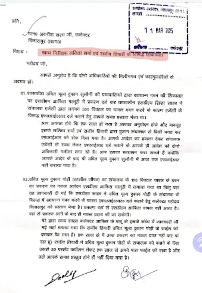बता दें कि, यह पूरा मामला मस्तूरी क्षेत्र के दुकानों में हुए चावल गबन की शिकायतों और जांच के बाद कार्रवाई न करने तथा फाइल को लंबे समय तक दबा कर रखने से जुड़ा हुआ है.. दरअसल शिकायत में कहा गया है!