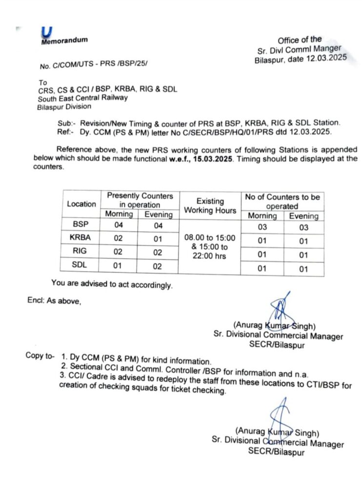 बिलासपुर,,, दक्षिण पूर्व मध्य रेलवे बिलासपुर जोन के अंतर्गत बिलासपुर डिवीजन स्टेशन कोरबा, रायगढ़ शहडोल , अन्य स्थानों पर आरक्षित टिकट काउंटर की वर्तमान संख्या बढ़ाने की बजाय जो काउंटर संचालित है!