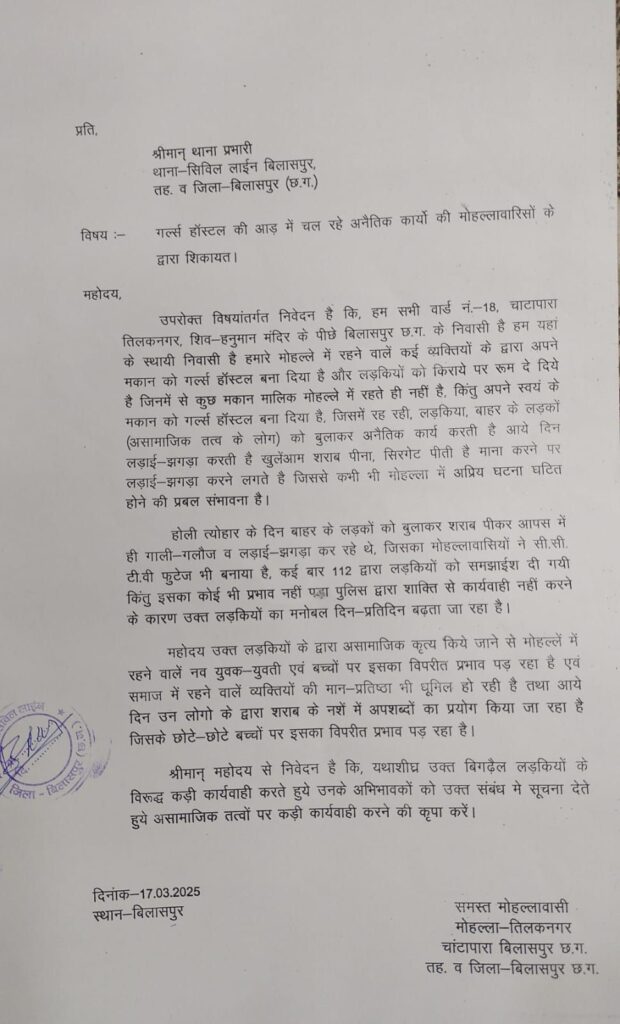 बिलासपुर,,, बिलासपुर के सिविल लाइन थाना क्षेत्र स्थित तिलकनगर में एक कथित गर्ल्स हॉस्टल के खिलाफ अनैतिक गतिविधियों को लेकर स्थानीय निवासियों ने पुलिस से शिकायत की है! मोहल्लेवासियों का आरोप है! कि यहां रहने वाली लड़कियां और मकान मालिक अवैध गतिविधियों को बढ़ावा दे रहे हैं! जिससे इलाके का माहौल खराब हो रहा है! मोहल्ले के लोगों ने इस मामले में थाना सिविल लाइन में शिकायत दर्ज कराते हुए सख्त कार्रवाई की मांग की है!
