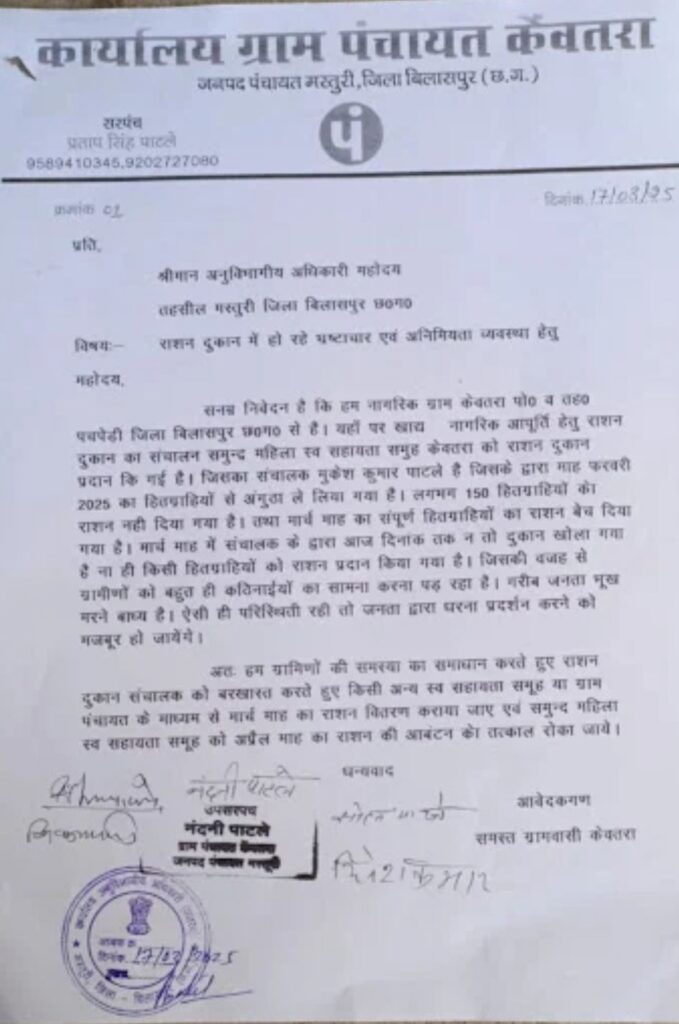 ग्राम पंचायत केवतरा के उप सरपंच प्रतिनिधि और पूर्व सरपंच ने जानकारी देते हुए बताया कि, महिला समूह द्वारा ग्राम पंचायत केवतरा में शासकीय उचित मूल्य दुकान का संचालन किया जाता है! महिला समूह की अध्यक्ष का पति मुकेश पाटले द्वारा विक्रेता का कार्य किया जाता है, लंबे समय से विक्रेता द्वारा अध्यक्ष के साथ मिलकर ग्रामवासियों के राशन को गबन करने का काम किया जा रहा है!