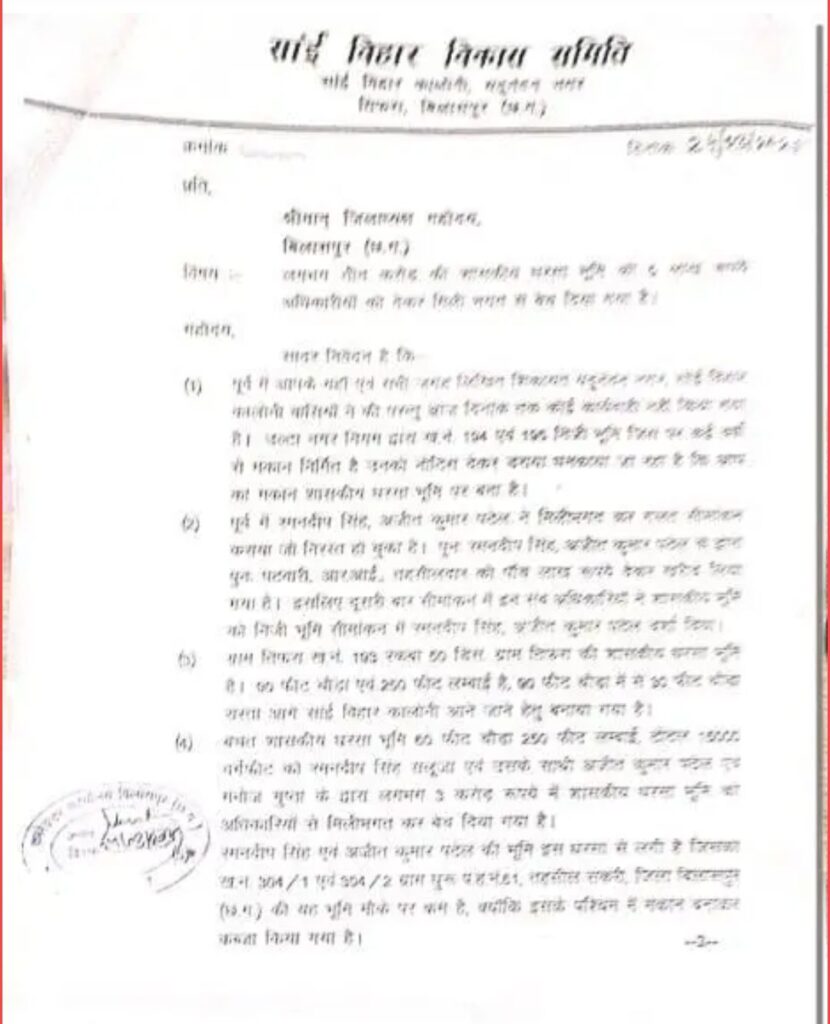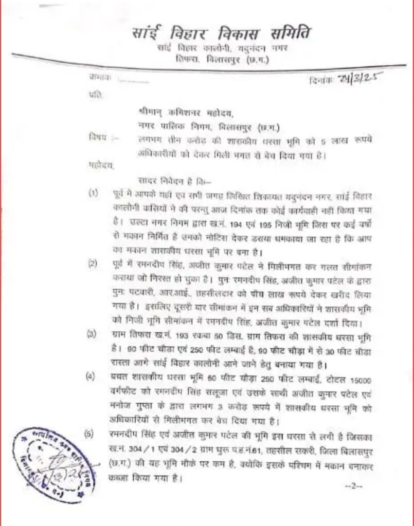 बिलासपुर,,, न्यायधानी बिलासपुर में भूमाफिया और भ्रष्ट अधिकारियों की मिलीभगत से एक बड़े घोटाले का पर्दाफाश हुआ है! इस घोटाले में भूमाफियाओं ने सरकारी भूमि का अवैध तरीके से सौदा किया है! और 3 करोड़ रुपये की राशि का लेन-देन किया है! आरोप है! कि इन भूमाफियाओं के साथ मिलकर राजस्व और नगर निगम के अधिकारियों ने मिलकर इस अवैध प्लॉटिंग को अंजाम दिया! इस घोटाले का शिकार 20 वर्षों से मकान बनाकर रह रहे भूस्वामियों पर संकट का दौर आ गया है!