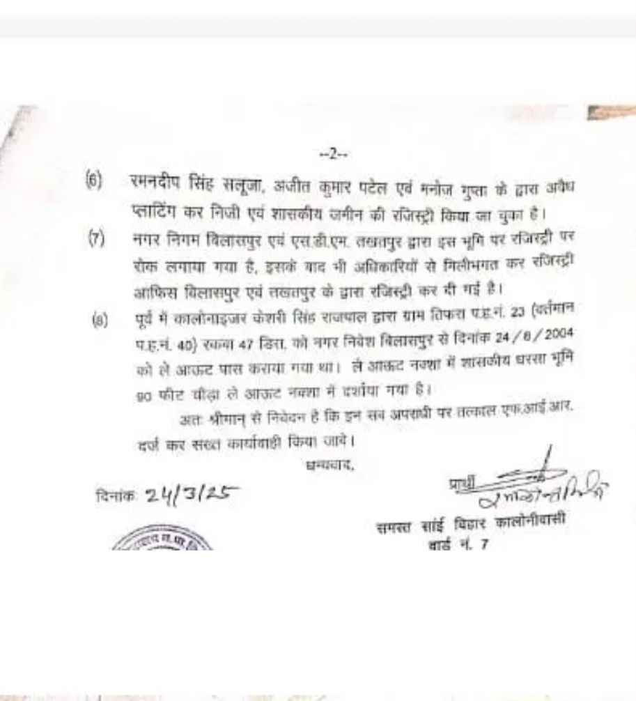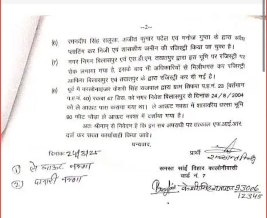 स्थानीय जनप्रतिनिधियों, भूस्वामियों और साईं विहार विकास समिति ने कलेक्टर, कमिश्नर और महापौर को इस मामले में लिखित शिकायत दी है। भूस्वामियों का आरोप है! कि जब नगर निगम ने मकानों के नक्शे को पास किया और संपत्ति कर भी लिया, तो अब उन्हें कैसे अवैध कब्जा ठहराया जा सकता है? इसके अलावा, घुरु स्थित खसरा क्रमांक 304/1 और 304/2 की शासकीय भूमि को भूमाफिया ने अवैध रूप से बेच दिया, जबकि निगम ने रजिस्ट्री पर रोक लगा दी थी। इसके बावजूद भूमि का रजिस्ट्रेशन और नामांतरण कैसे हुआ, यह सवाल उठता है!