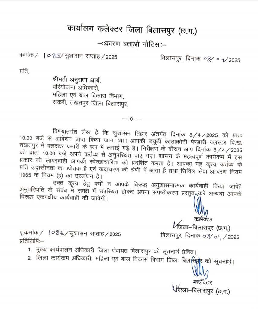 बिलासपुर,,, कलेक्टर अवनीश शरण ने सुशासन तिहार की ड्यूटी से नदारद सकरी की परियोजना अधिकारी महिला एवं बाल विकास विभाग श्रीमती अनुराधा आर्य को शो कॉज नोटिस जारी किया है! सकरी की सीडीपीओ श्रीमती आर्य की ड्यूटी तखतपुर विकासखण्ड के काठाकोनी पेण्डारी क्लस्टर में प्रभारी के रूप में लगाई गई है!