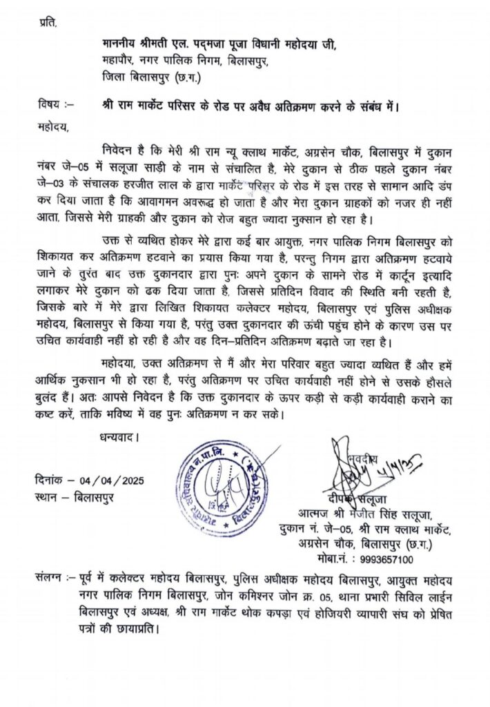 बिलासपुर,,, शहर के प्रमुख व्यावसायिक केंद्र श्री राम न्यू क्लाथ मार्केट, अग्रसेन चौक में अवैध अतिक्रमण का मामला तूल पकड़ता जा रहा है! बाजार स्थित दुकान नंबर जे-05, जिसे ‘सलूजा साड़ी’ के नाम से दीपक सलूजा संचालित करते हैं! के सामने लगातार अवरोध उत्पन्न किए जा रहे हैं!