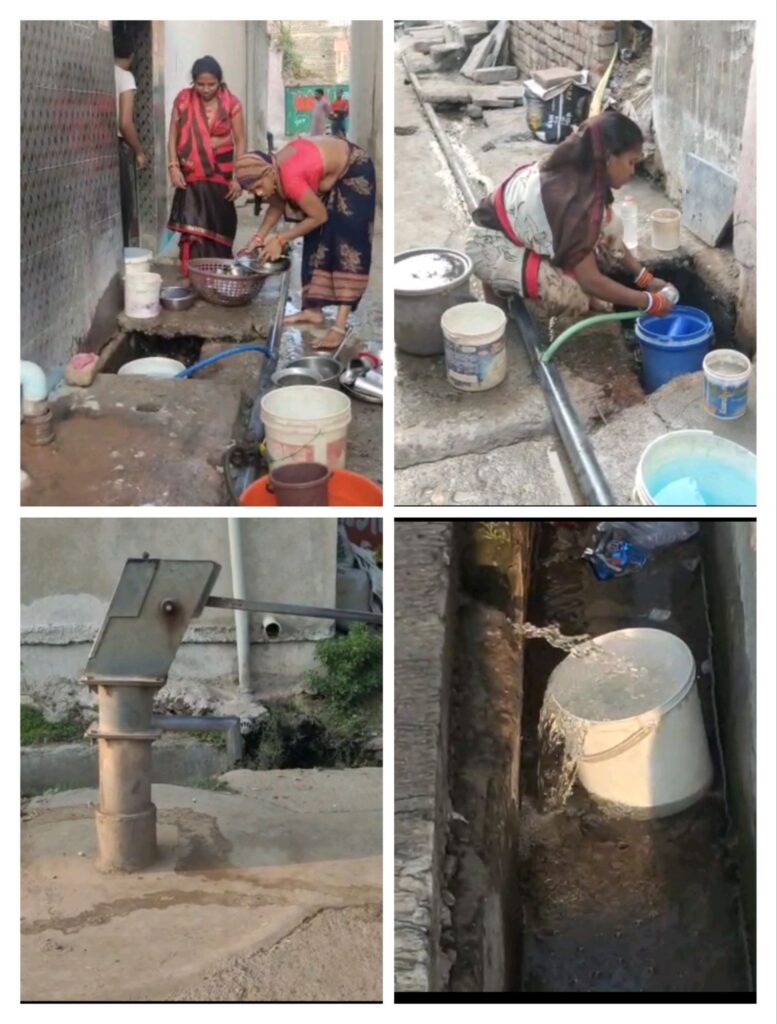 महिला नाली के अंदर बाल्टी रखकर पीने का पानी भर रही थी! वही पर एक ठप हैंड पम्प दिखा पूछने पर मोहल्ले वासियो ने बताया कि ये हैंडपंप कई महीनों से बन्द पड़ा है! पाइप लाइन में भी पानी का फोर्स कम होने के कारण पर्याप्त पानी नही मिल पा रहा!