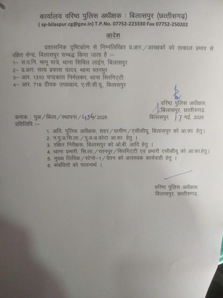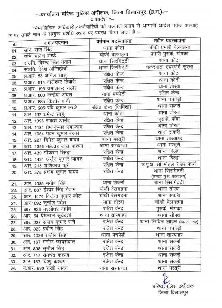 एसएसपी ने दो अलग-अलग आदेश जारी किए हैं! पहले आदेश में 34 और दूसरे में 4 पुलिसकर्मियों के नाम शामिल हैं! उपनिरीक्षक राज सिंह को कोटा से बेलगहना चौकी प्रभारी बनाया गया है! जबकि भावेश शेंडे को बेलगहना से मोपका पुलिस सहायता केंद्र भेजा गया है! सहायक उपनिरीक्षक भानू पात्रे को सिविल लाइन से बिलासपुर, प्रधान आरक्षक सत्यप्रकाश यादव को रतनपुर और आरक्षक चंद्रकांत निर्मलकर, दीपक उपाध्याय को लाइन अटैच किया गया है!