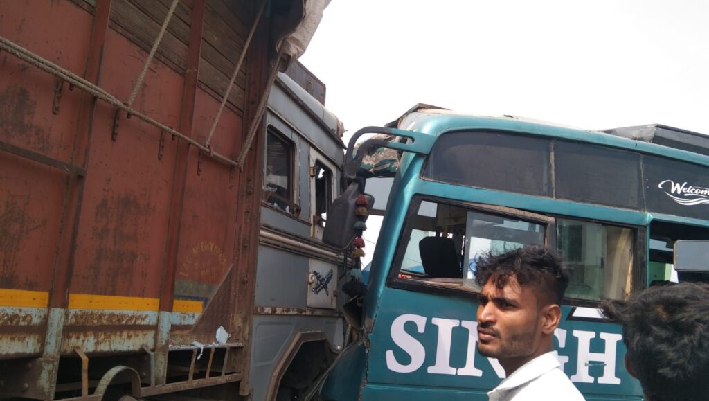 तखतपुर,,, मुंगेली से बिलासपुर की ओर जारी रही सिंह बस सर्विस की यात्रियो से भरी बस क्रमांक सीजी 10 जी 0323 सुबह करीब सवा नौ बजे पथरिया मोड़ के पास सामने से आ रही ट्रक भिड़ गई। इस जबरदस्त टक्कर में बस के सामने का हिस्सा बुरी तरह क्षतिग्रस्त और बस में सवार करीब 20 लोग घायल हो गए घायलों को सामुदायिक स्वास्थ्य केंद्र तखतपुर पहुंचाया गया जहां प्राथमिक उपचार के बाद बिलासपुर रेफर कर दिया गया।