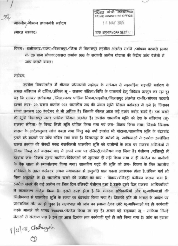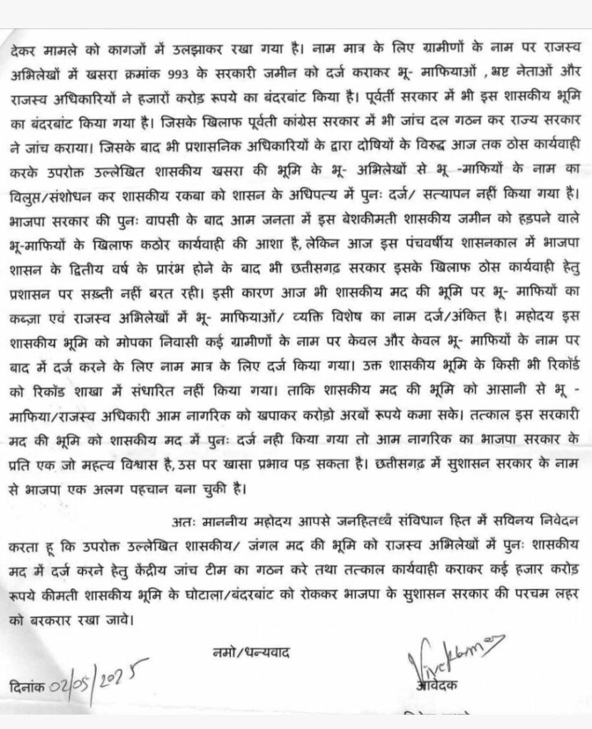 सरकारी जमीन को निजी बनाने वाले राजस्व अधिकारी और भू-माफियाओं के खिलाफ केंद्र सरकार से शिकायत** खसरा क्रमांक 993 की सरकारी जमीन घोटाले की जांच केंद्रीय जांच एजेंसी से कराने की मांग** मोपका में चलेगा बुलडोजर, सरकारी जमीन के अभिलेख होंगे दुरुस्त ?** राजस्व अभिलेखों में उसी खसरा की जमीन उनके नाम पर दर्ज भी है लेकिन उन लोगों को उनका जमीन कहा है । यह पता ही नही, मतलब मोपका के खसरा क्रमांक 993 के मौका रकबा में काबिज़ ग्रामीणों के नाम पर पट्टा वितरण करने की बजाए, नियम विरुद्ध मनमाना पट्टा वितरण किया गया है। एक तरह से भ्रष्ट राजस्व अधिकारियों ने भू – माफियाओं को पट्टा बेचा है। शिकायतकर्ता की माने तो शासकीय खसरा के पट्टाधारियों ने राजस्व न्यायालय के बिना अनुमति स्वत्व की जमीन को बेच दिया और राजस्व आधिकारियों ने फटाफट नामांतरण भी कर दिया। यह सब बिना राजस्व आधिकारियों के भ्रष्टाचार के बिना संभव नही था। यहां तक कि जांच में यह भी बात सामने आया है कि बिना सक्षम अधिकारी के पट्टा वितरण किया गया है। उसके बाद भी भ्रष्टाचारियों और भू – माफियाओं के खिलाफ आज तक ठोस कार्यवाही नही किया गया। जिसके कारण जनहित में प्रधानमंत्री कार्यालय में शिकायतकर्ता ने शिकायत प्रस्तुत किया है। जिस पर पीएमओ के निर्देश पर डिप्टी कलेक्टर शिव कंवर बिलासपुर को जांच का जिम्मा सौंपा गया है । अब देखना होगा कि जांच कार्यवाही का प्रतिवेदन प्रधानमंत्री कार्यालय को कब तक सौंपा जाता है?