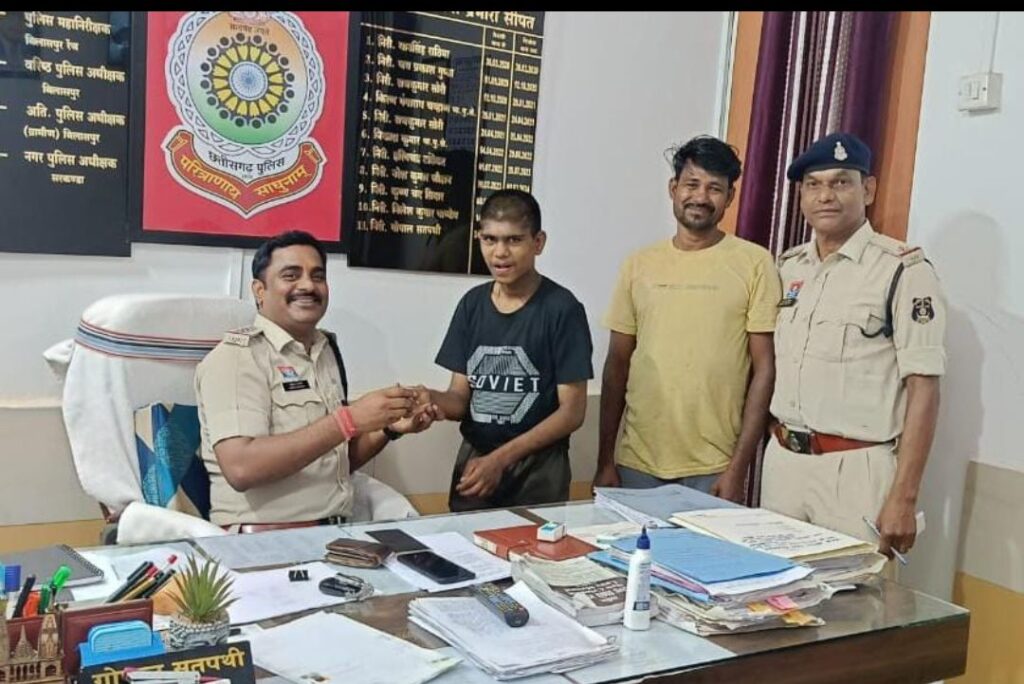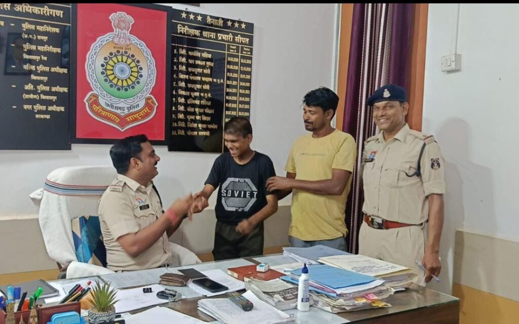 जो गुम इंसान विजय वाडा (राजस्थान) में रेल्वे स्टेशन में जहंा अनाथ बच्चे रह रहे थे! में था जहां किसी रेल्वे पुलिस कर्मचारी द्वारा उक्त गुम बालक को च्वाईस सेंटर में लेजाकर फिंगर प्रिंट लेने से उक्त बालक का ग्राम पोंडी थाना सीपत जिला बिलासपुर का होना पता चला जिनके द्वारा सीपत थाना को सूचित करने से मानसिक रूप से कमजोर गुम बालक के परिजन को बताकर विजय वाडा राजस्थान से उक्त गुम बालक को दस्तयाब कर परिजनों को सुपुर्द किया गया माता पिता उक्त बालक को अपने पास पा कर चेहरे पर मुस्कान लौटी जो उक्त बालक की उम्मीद छोड चुके थे! उक्त बालक को दस्तयाब करने में थाना प्रभारी निरीक्षक गोपाल सतपथी, सउनि भारत सिंह मरकाम का योगदान रहा!