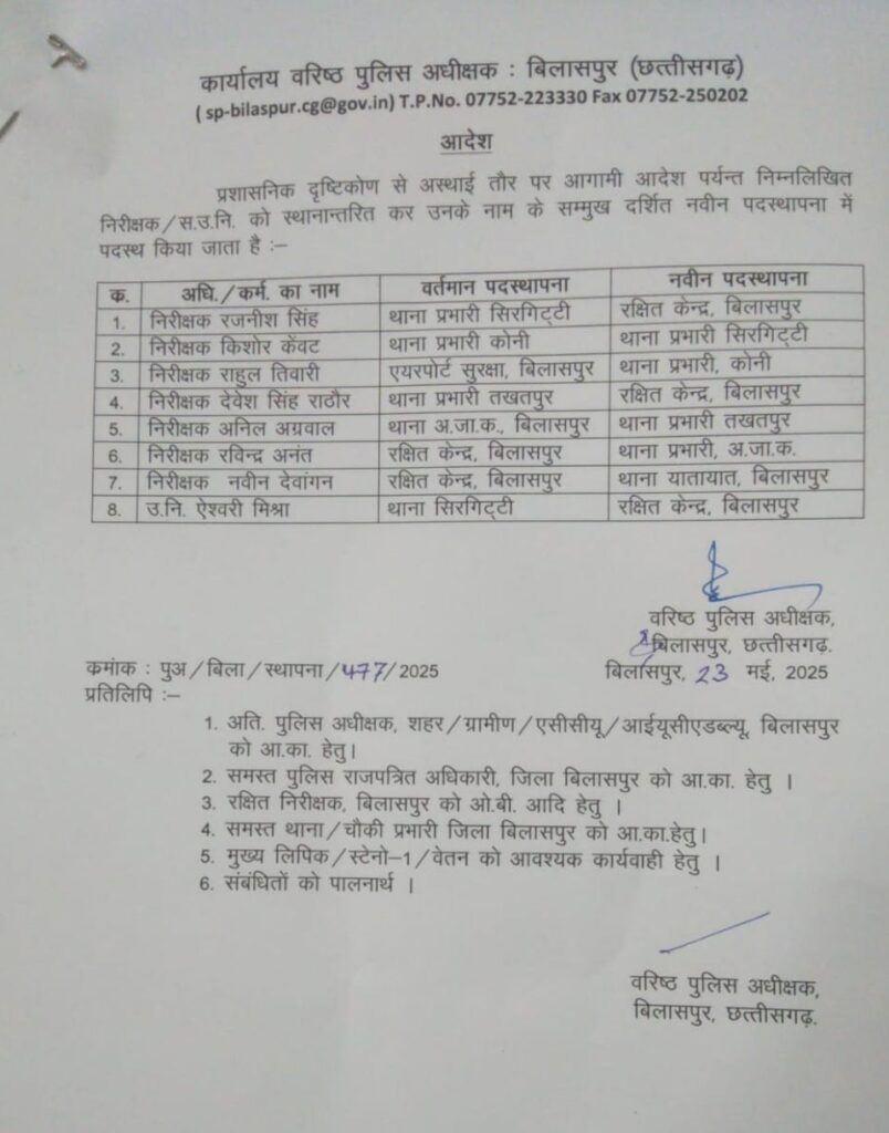 इसी तरह तखतपुर थाना प्रभारी देवेश सिंह राठौर को भी लाइन भेजा गया है! जबकि विवादो में बने रहने वाले अनिल अग्रवाल को तखतपुर थाना भेजा गया है!