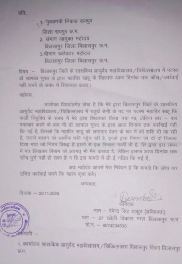 बिलासपुर,,, छत्तीसगढ़ के बिलासपुर में आयुर्वेद विभाग से जुड़े एक फर्जी नियुक्ति का मामला सुर्खियों में है! जहां इस नियुक्ति मामले में आयुर्वेद महाविद्यालय/ चिकित्सालय के प्राचार्य/अधीक्षक पर कार्यवाही नहीं करने का आरोप लगाया गया है! इस प्रकरण में एक ही व्यक्ति द्वारा दो अलग अलग अंकसूची का उपयोग कर चतुर्थ श्रेणी के पद पर नियुक्ति पाने का आरोप लगाया गया है!