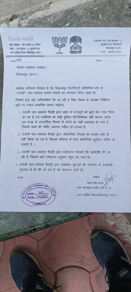 बिलासपुर,,,जिले के सिरगिट्टी औद्योगिक परिक्षेत्र में स्थित राजश्री पान मसाला फैक्ट्री एक बार फिर विवादों में घिर गई है। स्थानीय नागरिकों ने फैक्ट्री संचालन में गंभीर अनियमितताओं का आरोप लगाते हुए प्रशासन से इसे बंद करने की मांग की है। फैक्ट्री प्रबंधन पर लगाए गए आरोपों में अवैध श्रमिक भर्ती, औद्योगिक सुरक्षा मानकों की अनदेखी, और पर्यावरण नियमों का उल्लंघन प्रमुख हैं। क्षेत्रवासियों का कहना है कि बाहरी राज्यों से लाए गए श्रमिकों को बिना किसी पुलिस सत्यापन के नियुक्त किया गया है,