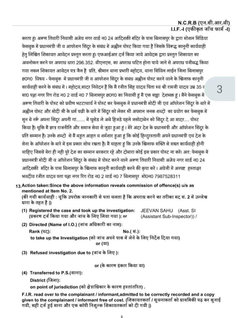 बिलासपुर,,, ऑपरेशन सिंदूर को लेकर देश के पीएम के खिलाफ फेसबुक में अभद्र पोस्ट करने वाले पूर्व विधायक अरुण तिवारी के खिलाफ सिविल लाइन पुलिस ने मामला दर्ज कर लिया है! मामला संज्ञान में आने के बाद जिलाभाजपाध्यक्ष ने उनके खिलाफ एफआइआर दर्ज कराई!