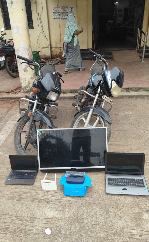 प्रकरण में बरामद किये गये 02 नग मोटर सायकल, 02 नग लैपटाप, 01 एलईटीव्ही के स्वामी की पतासाजी की जा रही है।