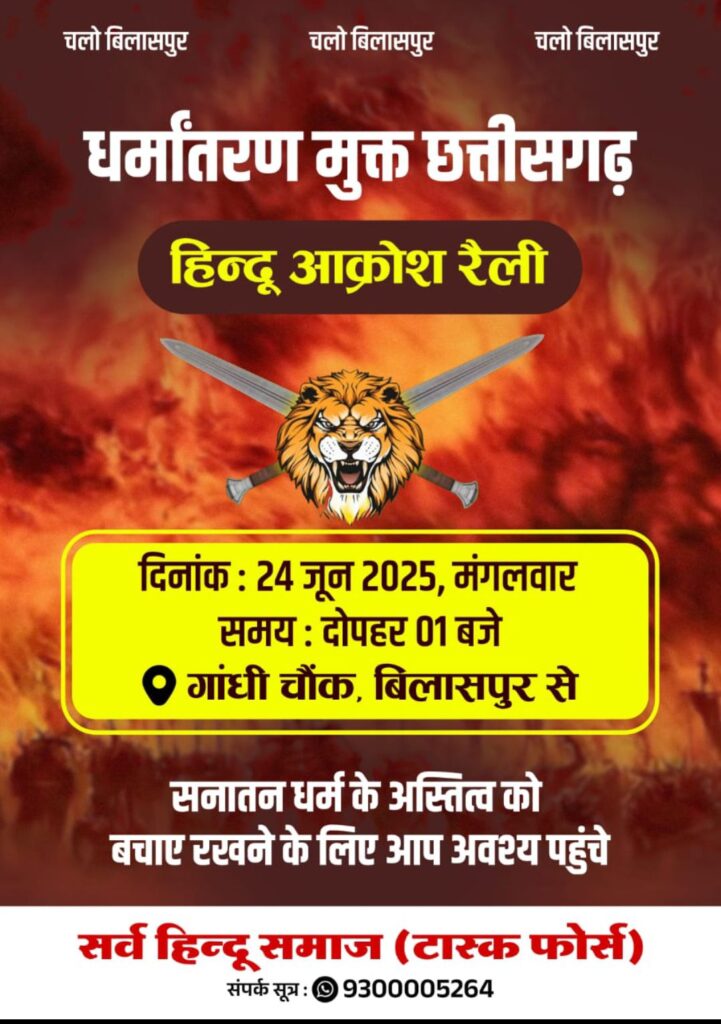 बिलासपुर,,, छत्तीसगढ़ को धर्मांतरण मुक्त बनाने के उद्देश्य से हिन्दू आक्रोश रैली का आयोजन किया जा रहा है! यह विशाल जनसमूह 24 जून, मंगलवार को दोपहर 1 बजे से गांधी चौक, बिलासपुर से प्रारंभ होगा!