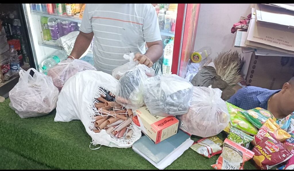 खम्हारडीह, खमतराई, आजाद चौक एवं सरस्वती नगर के लगभग 50 से अधिक ठेलों, गुमटियों व रोड किनारे लगने वाले दुकानों के संचालकों के कब्जे से गांजा पीने हेतु उपयोग करने वाले लगभग 2600 नग गोगो पेपर, 400 नग रोल पेपर, 550 नग चिलम, प्रतिबंधित हुक्का से संबंधित 10 पैकेट फ्लेवर, हुक्का से संबंधित अलग-अलग 25 नग सामान, 04 पैकेट प्रतिबंधित सिगरेट, 04 नग
