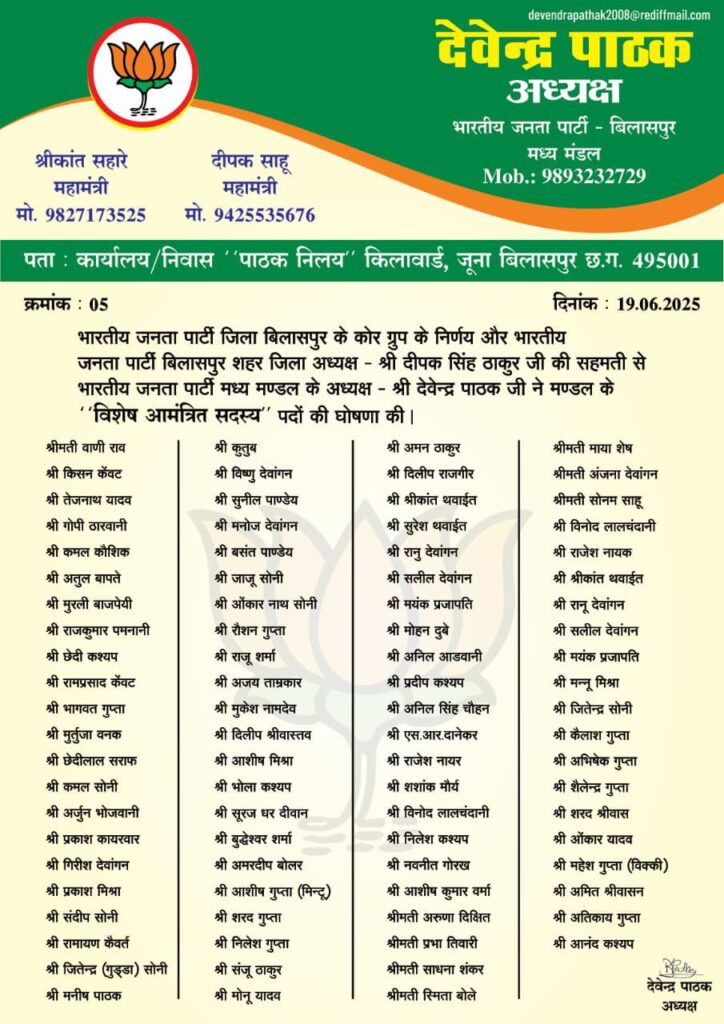 बिलासपुर,,, भारतीय जनता पार्टी मध्य मंडल में संगठन को मजबूती देने और कार्यकर्ताओं के अनुभव का लाभ लेने के उद्देश्य से एक महत्वपूर्ण निर्णय लिया गया है! मंडल स्तर पर पार्टी के सभी ज्येष्ठ-श्रेष्ठ कार्यकर्ताओं को विशेष आमंत्रित सदस्य बनाया गया है!