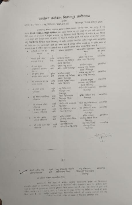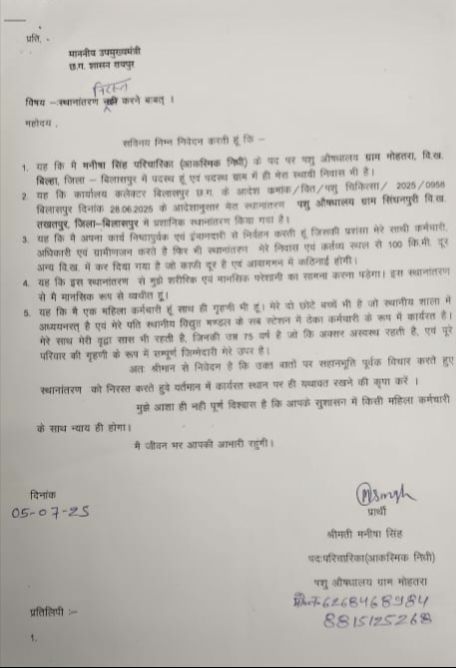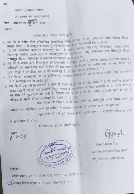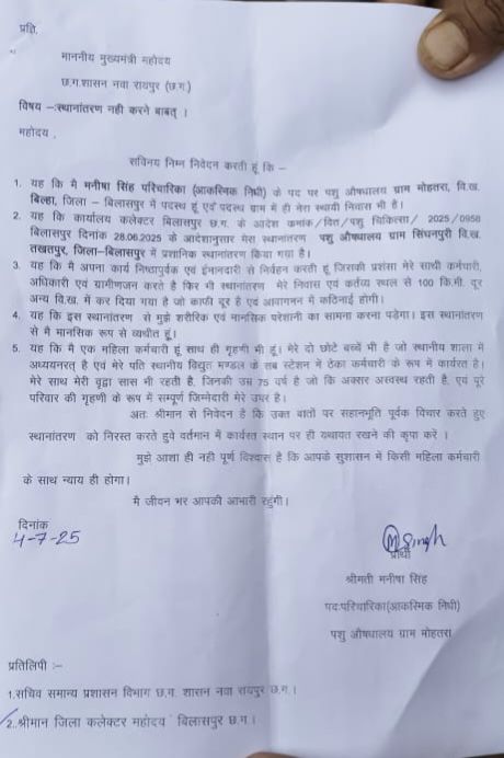 बिल्हा ब्लॉक के ग्राम मोहतरा के पशु चिकित्सा विभाग कि परिचारक मनीषा सिंह पति अजय कुमार सिंह का तबादला तखतपुर ब्लॉक के सिंगनपुरी में कर दिया गया! इसमें 2 बड़ा फॉल्ट है! एक तो परिचारक मनीषा सिंह आकस्मिक निधि में है! यानी नियमित ही नहीं है! और दूसरा उन्होंने अपने स्थानांतरण के लिए आवेदन ही नहीं किया है! उनका नाम 10 के बाद 11 वे नंबर पर अलग से अंकित है!