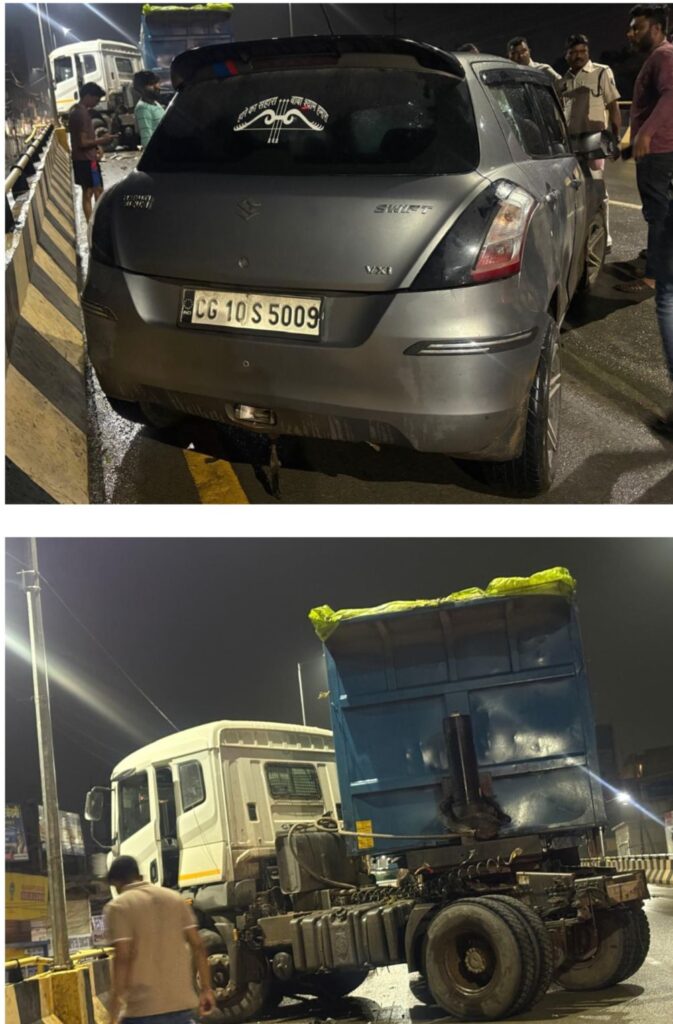 बिलासपुर से रायपुर जाते समय राजीव गांधी चौक के पास फ्लाई ओवर में जैसे ही ऊपर चढ़े, ठीक वही पर ट्रेलर और स्विफ्ट कार में जबरदस्त भिड़ंत हो गई! रायपुर तरफ से आ रही ट्रेलर और बिलासपुर से बैतलपुर के लिए जा रही स्विफ्ट कार आपस में टकरा गई!