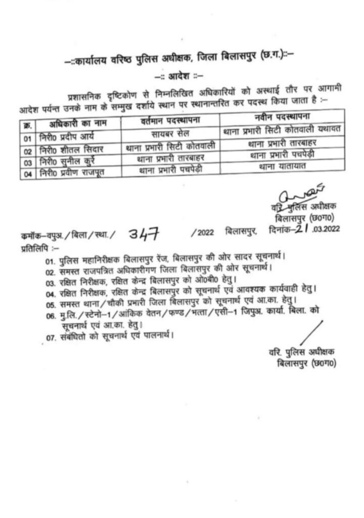 बिलासपुर :-पुलिस अधीक्षक पारुल माथुर ने आज तबादला आदेश जारी किया जिसमे 4 थानेदार को इधर से उधर किया गया,आपको बता दे कि पुलिस अधीक्षक पारुल माथुर ने सायबर सेल प्रभारी प्रदीप आर्या को सिटी कोतवाली में यथावत रखा है,इसी तरह प्रवीण राजपूत को पचपेड़ी से यातायात में लाया गया है जबकि सिटी कोतवाली में पदस्थ शीतल सिदार को तारबाहर थाने की जवाबदारी दी गयी है। तारबाहर थाना प्रभारी सुनील कुर्रे को पचेपडी थाने की जिम्मेदारी दी गई है।