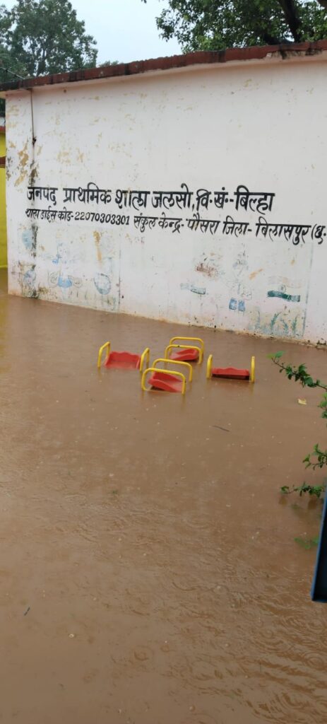 बिलासपुर,,,, विकासखंड बिल्हा के अंतर्गत आने वाली शासकीय प्राथमिक शाला जलसों इन दिनों गंभीर अव्यवस्थाओं से जूझ रही है!लगातार बारिश और जल निकासी की समुचित व्यवस्था नहीं होने के कारण स्कूल परिसर में घुटनों तक पानी भर गया है! विद्यालय का मैदान और आसपास का पूरा क्षेत्र तालाब में तब्दील हो चुका है!नतीजतन, बच्चों के लिए स्कूल पहुँचना कठिन हो गया है! वहीं शिक्षकों को भी भारी परेशानियों का सामना करना पड़ रहा है!