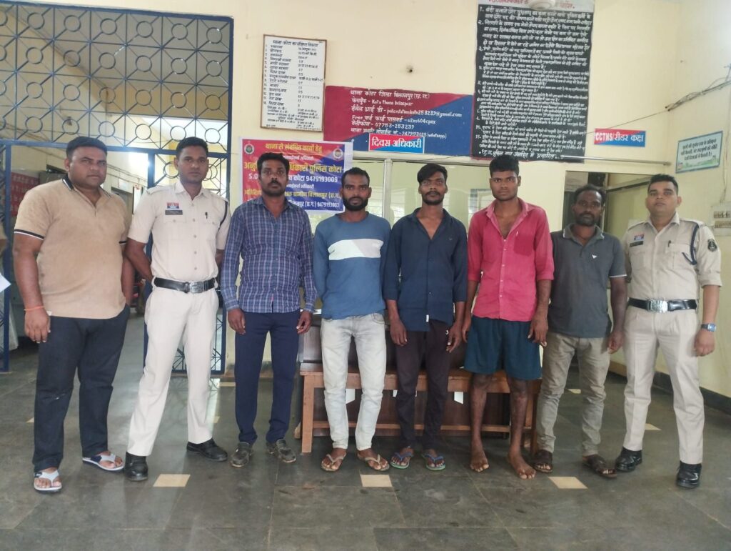 बिलासपुर,,, बीते माह सागौन तस्करी में संलिप्त तस्करों ने वन अधिकारी को जान से मारने की धमकी देते हुए मारपीट की घटना को अंजाम देने वाले फरार आरोपियों को पुलिस ने पकड़ने में सफलता पाई है! जहां इन आरोपियों को गिरफ्तार कर हिरासत में ले लिया गया! कोटा पुलिस से मिली जानकारी के अनुसार प्रार्थी विवेक देवांगन परिक्षेत्र अधिकारी कोटा (कोटा वन वृत) थाना उपस्थित आकर रिपोर्ट दर्ज कराया कि दिनांक 01.06.2025 को ग्राम सेमरिया में अवैध रूप से कुछ व्यक्ति सागौन लकड़ी की तस्करी कर रहे की सूचना पर वन विभाग की टीम के द्वारा छापामारी की कार्रवाई की गई इसी दौरान आरोपियों के द्वारा गली गलौज कर जान से मारने की धमकी देते हुए शासकीय कार्य में बाधा डाला गया है! कि रिपोर्ट पर अपराध दर्ज कर इस घटना में शामिल 01. दिनेश ध्रुव पिता अंधियार सिंह उम्र 24 वर्ष निवासी ग्राम सेमरिया थाना कोटा 02. नील कुमार घृतलहरे पिता मोहित राम उम्र 28 वर्ष निवासी ग्राम बांधा थाना तखतपुर 3. भुरवा उर्फ अंधियार सिंह पिता गोविंद सिंह उम्र 55 वर्ष 4. शकुन बाई गोड पति तम्पाल सिंह को पूर्व में ही तत्काल गिरफ्तार कर न्यायिक रिमांड पर भेजा गया था। मामले की जांच और विवेचना के दौरान इस मामले में अन्य लोगों के नाम सामने आए।जो घटना के बाद से फरार हो गए थे।पुलिस ने फरार आरोपी 1. रामेश्वर बंजारे 2.प्रकाश मधुकर 3. पंकज खांडे 4.सनत मधुकर 5.धन्नू पाटले सभी निवासी ग्राम सेमरिया थाना कोटा को विधिवत गिरफ्तार करके न्यायिक रिमांड पर भेजा गया है।