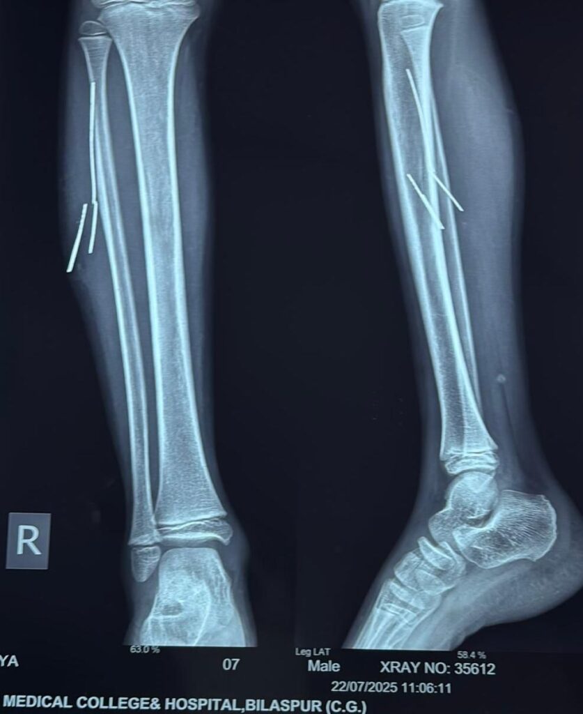 बिलासपुर,,,, सिम्स बिलासपुर ने चिकित्सकीय क्षेत्र में एक और महत्वपूर्ण उपलब्धि दर्ज की है! रेडियोलॉजी विभाग और सर्जरी विभाग के संयुक्त प्रयास से ऑपरेशन के दौरान सोनोग्राफी की मदद से एक 10 वर्षीय बालक के पैर में फंसे लोहे के चार तार को सफलतापूर्वक निकाला गया!