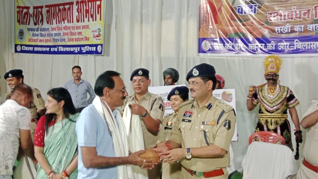 बिलासपुर,,,, वरिष्ठ पुलिस अधीक्षक रजनेश सिंह के दिशा निर्देश एवं मार्गदर्शन में महापर्व रक्षाबंधन के पावन अवसर पर यातायात पुलिस बिलासपुर के द्वारा नागरिको एवं वाहन चालकों को महिलाओं (बहनों) के प्रति सदैव सुरक्षा, सम्मान और संरक्षण के भाव के साथ-साथ यातायात नियमों के प्रति संवेदनशील और गंभीर होकर स्वयं की सुरक्षा के प्रति भी सतर्क रहें इस संदेश के साथ आज पुलिस लाइन परेड ग्राउंड में विशेष कार्यक्रम का आयोजन किया गया।
