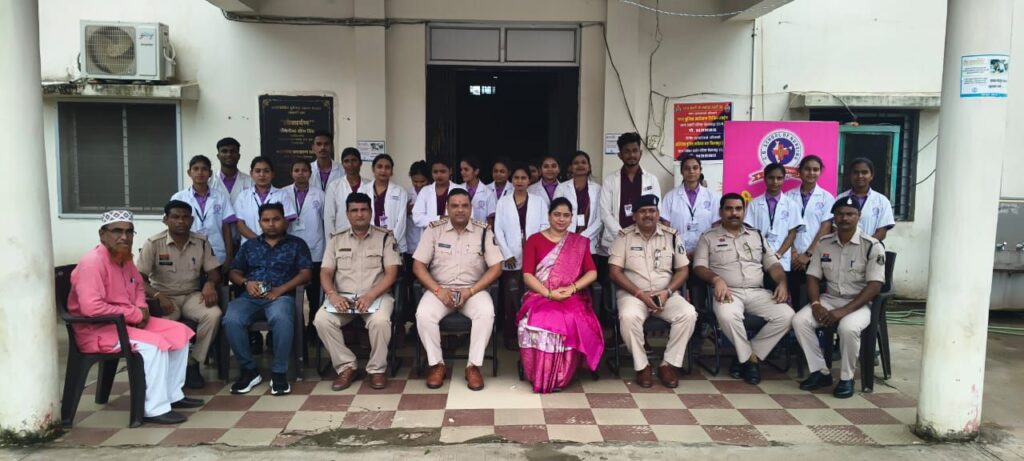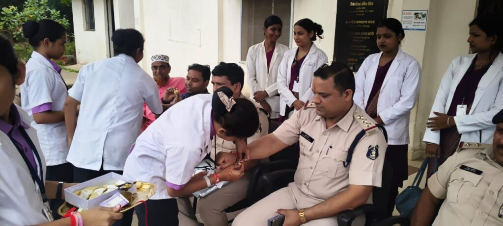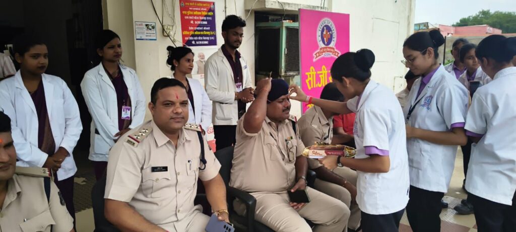 बिलासपुर_सकरी,,, रक्षाबंधन के पावन पर्व को एक नई सामाजिक और भावनात्मक ऊंचाई देते हुए नर्सिंग कॉलेज सकरी की छात्राओं एवं कॉलेज स्टाफ द्वारा थाना सकरी के पुलिस स्टाफ को राखी बांधकर ‘राखी विद खाकी’ कार्यक्रम का आयोजन किया गया! इस अवसर पर छात्राओं ने पुलिस जवानों की कलाई पर रक्षा सूत्र बांधते हुए उनके द्वारा समाज में निभाई जा रही सुरक्षा और सेवा की भावना के प्रति आभार प्रकट किया!