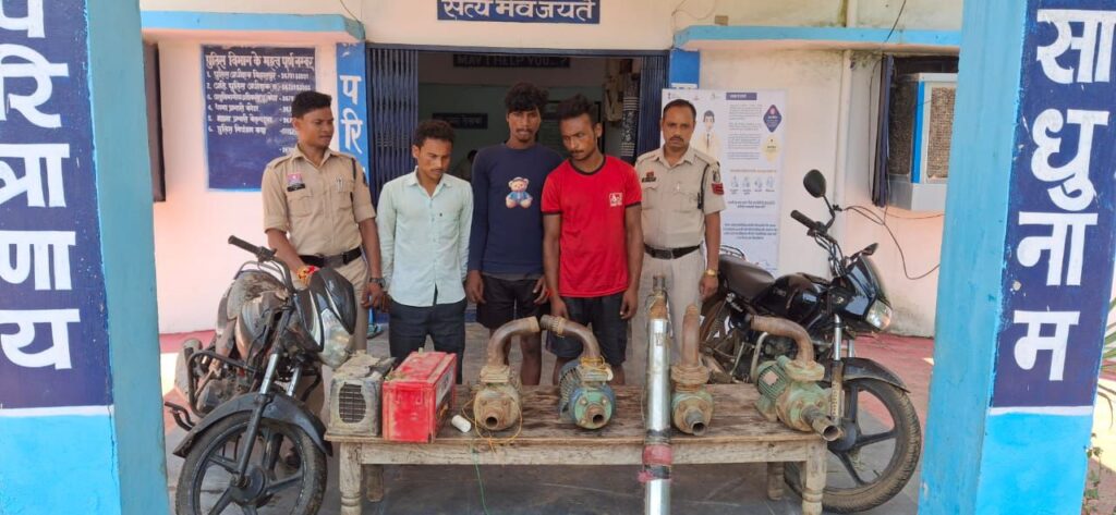 बिलासपुर,,,,, चौकी बेलगहना थाना कोटा क्षेत्र में पानी मोटर पंप और बैटरी चोरी के मामले में पुलिस ने तीन आरोपियों को गिरफ्तार कर लगभग ₹1.40 लाख का सामान बरामद किया! थाना प्रभारी राज सिंह की टीम ने बेहतरीन कार्यवाही कर गिरोह का किया पर्दाफाश दिनांक 29.05.2025 को प्रार्थी रिपोर्ट दर्ज कराया की उसके घर के कुआं में लगे हुए सबमर्सिबल पंप को किसी अज्ञात व्यक्ति द्वारा चोरी कर ले गया है की प्रार्थी की रिपोर्ट पर चौकी बेलगहना में धारा सदर का अपराध कायम कर विवेचना में लिया गया मामले में विवेचना दौरान चौकी बेलगहना के पूर्व चोरी की अपराध में गिरफ्तार आरोपी संदेही सुभाष निषाद को चौकी में तलब कर पूछताछ कर मेमोरेंडम कथन लिया गया. जो अपने मेमोरेंडम में बताया कि ग्राम कूपाबांधा दारसागर बानाबेल छतौना नवाडीह से अपने साथी उजियार अगरिया और बिहारीलाल प्रजापति के साथ मिलकर विभिन्न कंपनियां के 2 नग बैटरी एवं 5 नग पानी मोटर पंप को चोरी करना बताने पर उसके साथी उजियार अगरिया और बिहारी लाल प्रजापति को हिरासत मे लेकर उनका भी मेमोरेंडम कथन लिया गया जो अपने साथी तीनों मिलकर चोरी करना स्वीकार किया तथा चोरी के मसरूका को अपने-अपने घर में छुपा कर रखना बताएं. उक्त सम्बन्ध मे तत्काल वरिष्ठ अधिकारियो को अवगत कराया गया जो श्रीमान पुलिस अधीक्षक महोदय श्री रजनेश सिंह (भा.पु.से.) द्वारा तत्काल कार्यवाही करने हेतु निर्देशित किया, के परिपालन व निर्देशानुसार व श्रीमती अर्चना झा (रा. पु.से.) अतिरिक्त पुलिस अधीक्षक ग्रामीण एवं श्रीमती नुपूर उपाध्याय (रा.पु.से.) अनुविभागीय अधिकारी पुलिस कोटा के मार्गदर्शन में टीम गठित कर हमराह स्टॉफ के आरोपी सुभाष निषाद के घर जाकर उसके कब्जे से एक नग सबमर्सिबल पंप, एक नग बैटरी, दो नग मोनोब्लाक कंपनी का पानी मोटर पंप को बरामद कर जप्त किया गया. आरोपी उजियार अगरिया के कब्जे से एक एमरान कंपनी का बैटरी एवं एक मोनोब्लॉक कंपनी का पानी मोटर पंप, तथा बिहारीलाल प्रजापति के कब्जे से एक नग लूबी कंपनी का पानी मोटर पंप तथा घटना में प्रयुक्त मोटरसाइकिल क्रमांक सीजी 10 बी व्ही 7681 तथा आरोपी बिहारी लाल प्रजापति के द्वारा दीपिका जिला कोरबा क्षेत्र से चोरी किया हुआ TVS कंपनी का मोटरसाइकिल को पेश करने पर जप्त किया गया है, आरोपी सुभाष निषाद उजियार अगरिया के विरुद्ध धारा 303(2),3(5) bns तथा आरोपी सुभाष निषाद, उजियार अगरिया एवं बिहारी लाल प्रजापति के विरुद्ध धारा 35(1-5) BNSS, 303(2),3(5) BNS का पाए जाने से विधिवत गिरफ्तार क़र न्यायिक रिमाण्ड में भेजा जाएगा। उक्त कार्यवाही में चौकी बेलगहना प्रभारी उप निरीक्षक राज सिंह के मार्गदर्शन में ASI भरत राठौर, HC 520 नरेन्द्र कुमार पात्रे, आरक्षक ईश्वर नेताम,धीरज जायसवाल, अंकित जायसवाल, कौशल बिंझवार, लरंग साय क
