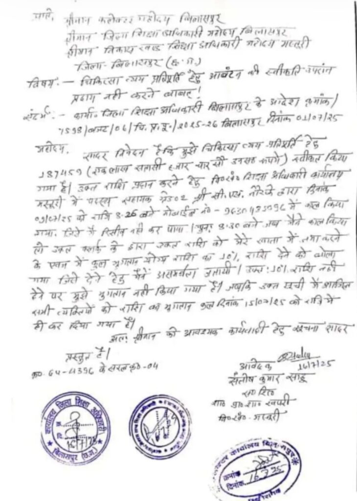 बिलासपुर,,,, जिले में शिक्षा देने वाले संस्थान के भीतर ही भ्रष्टाचार का चौंकाने वाला चेहरा उजागर हुआ है! मस्तूरी ब्लॉक शिक्षा कार्यालय में पदस्थ सहायक ग्रेड-02 सी.एस. नौरके का रिश्वत मांगने वाला ऑडियो सोशल मीडिया पर वायरल हो गया है!