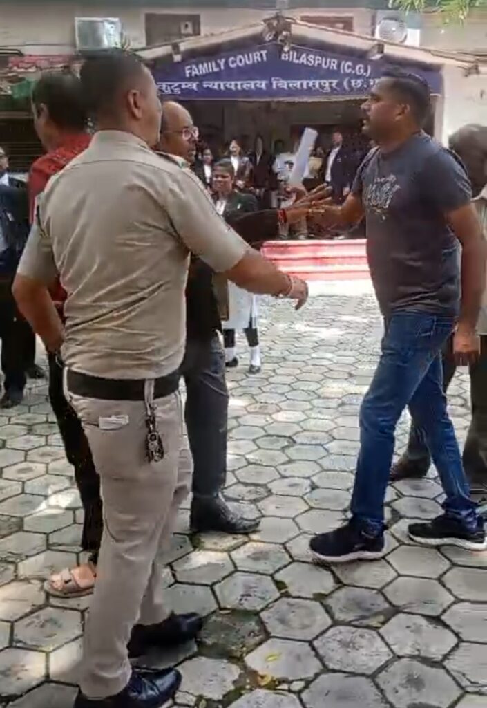 बिलासपुर,,, कुटुंब न्यायालय बिलासपुर में शुक्रवार को उस समय अफरा-तफरी मच गई! जब प्रधान आरक्षक अरुण कमलवंशी ने अदालत परिसर में ही गुंडागर्दी कर दी! तलाक केस की सुनवाई के दौरान वह दूसरी वाहिनी बटालियन के सिपाही संजय जोशी से भिड़ गए! और अदालत से बाहर निकलते ही कॉलर पकड़कर मुक्का-घूंसे से हमला कर दिया!