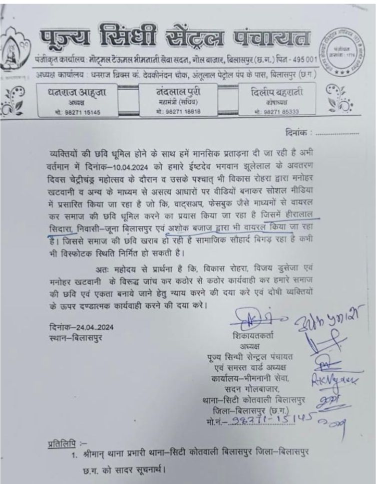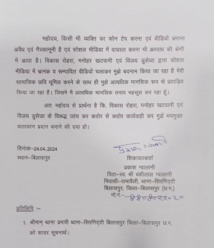 बिलासपुर—सिंधी समाज और समाज के व्यापारियों ने पुलिस कप्तान और एडिश्नल पुलिस कप्तान से तथाकथित दो पत्रकारों समेत तीन लोगों के खिलाफ भयादोहन और अवैध वसूली का आरोप लगाया है। समाज गणमान्य लोगों ने बताया कि विकास रोहरा मनोहर खटवानी और विजय डुसेजा ने पैसा वसूलने की नियत से भ्रामक और झूठा समाचार सोशल मीडिया में वायरल किया है। तीनों ने सुनियोजित तरीके से बातचीत के दौरान ना केवल आवाज रिकार्ड किया । बल्कि आडियो को कांट छांट कर प्रतिष्ठित लोगों की पगड़ी को उछाला है। तीनों के खिलाफ सख्त कार्रवाई की जाए।