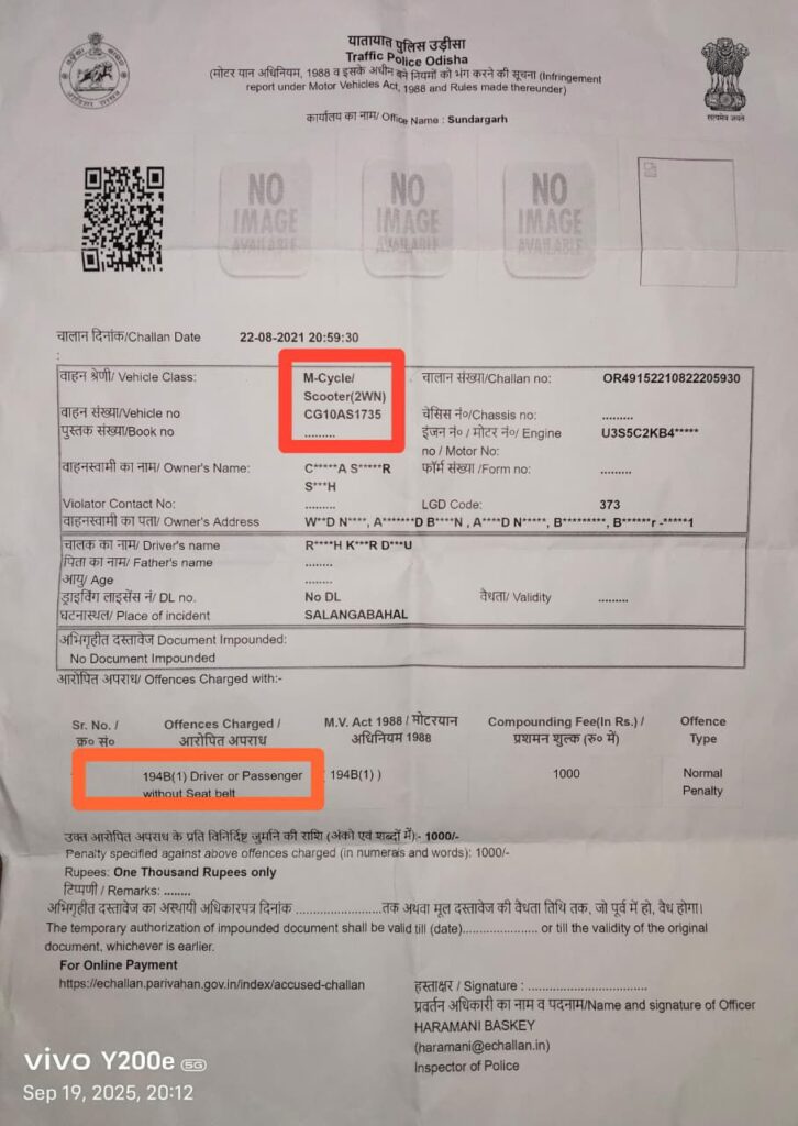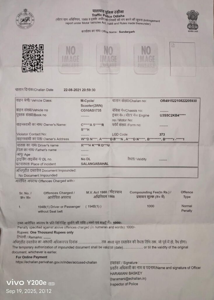 ये चालान सरकंडा के ठाकुर ट्रेवल्स कंपनी के संचालक राजू ठाकुर को उड़ीसा सुंदरगढ़ से मिला है! इसका पता भी उन्हें तब चला जब वे अपनी बुलेट को बेचने के लिए नाम ट्रांसफर कराने पहुंचे तब उन्हें बताया गया कि आपका सुंदरगढ़ उड़ीसा का 1हजार का चालान बाकी है!