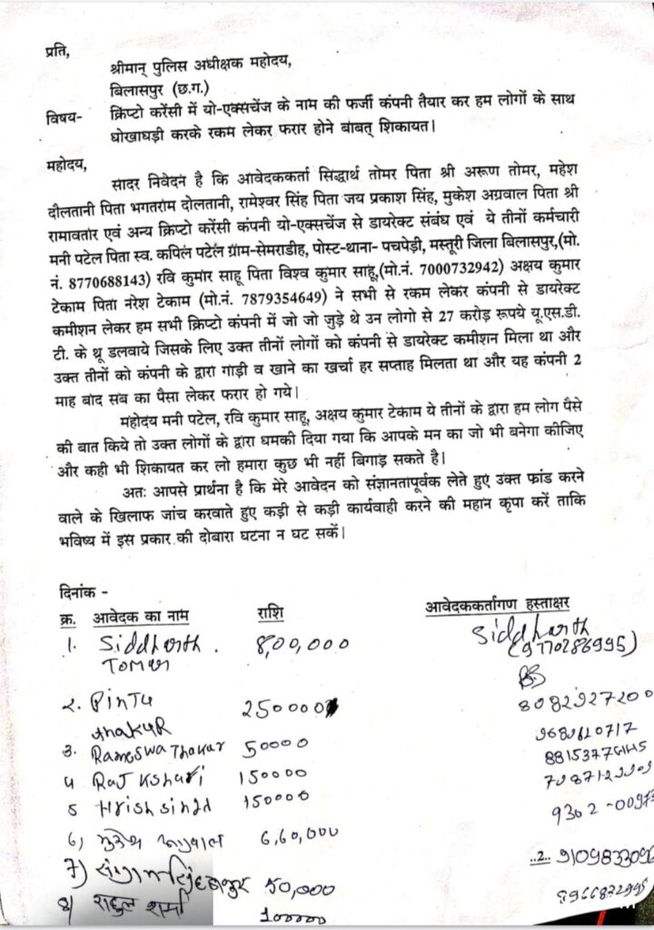 आज बड़ी संख्या में पीड़ित पुलिस कप्तान के दफ्तर पहुंचे और लिखित शिकायत दर्ज कराई! उनका आरोप है! कि इस क्रिप्टो घोटाले में सिर्फ बिलासपुर ही नहीं बल्कि आसपास के जिलों के लोग भी फंसे हैं! लोगों का कहना है! कि उन्हे बड़े-बड़े सपने दिखाकर हमारी गाढ़ी कमाई हड़प ली गई! वे अब न्याय चाहते हैं!” पीड़ितों ने मांग की है! कि जल्द से जल्द आरोपियों को गिरफ्तार किया जाए और जनता के पैसे की भरपाई की जाए!
