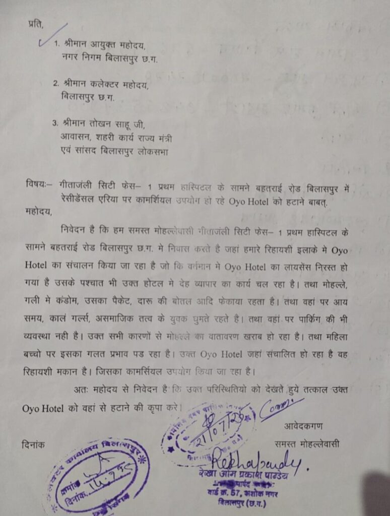बिलासपुर,,,, शहर में बिना अनुमति के निर्माण और अवैध होटल संचालन का मामला सामने आया है! बहतराई रोड स्थित गीतांजलि सिटी फेस-1 में नगर निगम ने एक बिल्डिंग मालिक ने नगर निगम से मंजूरी लिए बिना तीन मंजिला इमारत खड़ी कर ली और उसे OYO होटल के रूप में चला रहा था!