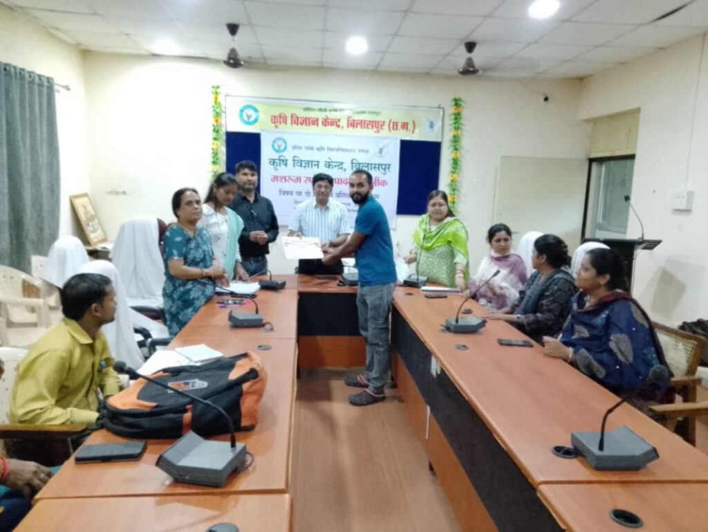 उपरोक्त प्रशिक्षण कार्यक्रम कृषि विज्ञान केंद्र के सम्पन्न हुआ! उक्त प्रशिक्षण कार्यक्रम में कृषि विज्ञान केंद्र के समस्त वैज्ञानिक गण डॉ शिल्पा कौशिक, जयंत साहू, डॉ. एकता ताम्रकार, हेमकांति बंजारे, इंजी. पंकज मिंज, डॉ निवेदिता पाठक, डॉ स्वाति शर्मा एवं डॉ. चंचला रानी पटेल ने कृषक प्रशिक्षणार्थियों को संबंधित विषयों की विस्तारपूर्वक तकनीकी जानकारी प्रदान की।