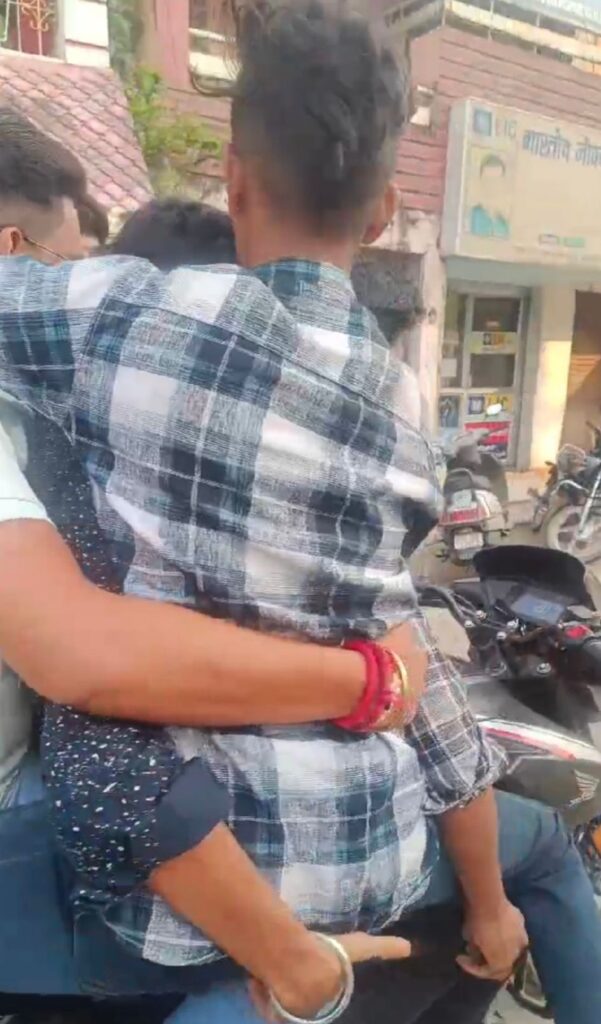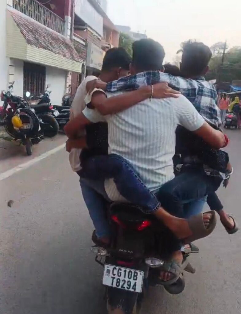 मिली जानकारी के अनुसार, यह घटना शहर के मुक्तिधाम रोड से सीपत चौक के बीच के क्षेत्र की बताई जा रही है! वीडियो में साफ दिख रहा है! कि बाइक पर सवार किसी भी युवक ने हेलमेट नहीं पहना है! सभी हंसते-खेलते सड़क पर चलते वाहन के बीचोंबीच चल रहे हैं! मानो सड़क उनकी निजी संपत्ति हो! दोपहिया वाहन पर केवल दो सवारियों की अनुमति होती है! लेकिन इन युवकों ने पांच लोग को बैठाकर यातायात नियमों की पूरी तरह धज्जियां उड़ा दीं! शहर में इस तरह की घटनाएं आम होती जा रही हैं! किशोर उम्र के युवक बिना लाइसेंस के बाइक चलाते हैं! स्टंट करते हैं! और वीडियो बनाकर सोशल मीडिया पर डालते हैं! इससे हादसे का खतरा कई गुना बढ़ जाता है! पिछले कुछ महीनों में इसी तरह की लापरवाही के कारण कई गंभीर सड़क हादसे हो चुके हैं! जिनमें कई युवकों को अपनी जान गंवानी पड़ी है! वहीं जानकारों की माने तो सीसीटीवी कैमरों और तकनीकी माध्यमों से युवकों की पहचान की जा रही है! साथ ही पुलिस ने आम नागरिकों से अपील की है! कि ऐसे मामलों की सूचना तुरंत पुलिस को दें ताकि शहर में सुरक्षित यातायात व्यवस्था सुनिश्चित की जा सके…!